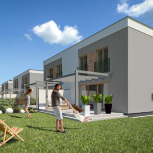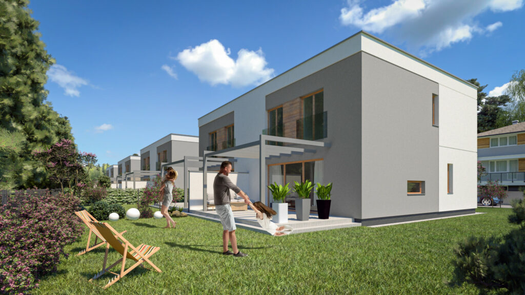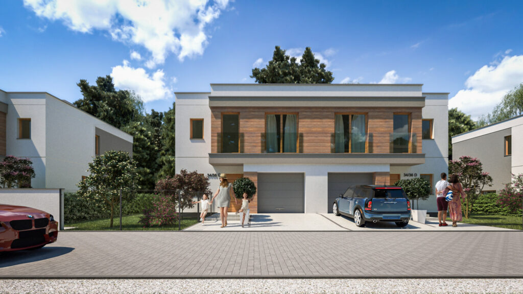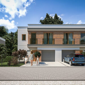 W bryle domów znajdują się garaże, a przed nimi dodatkowo jedno miejsce postojowe, więc nie będziesz mieć problemów z parkowaniem samochodów. Natomiast z salonu możesz wyjść na taras z pergolą i do ogrodzonego ogrodu.